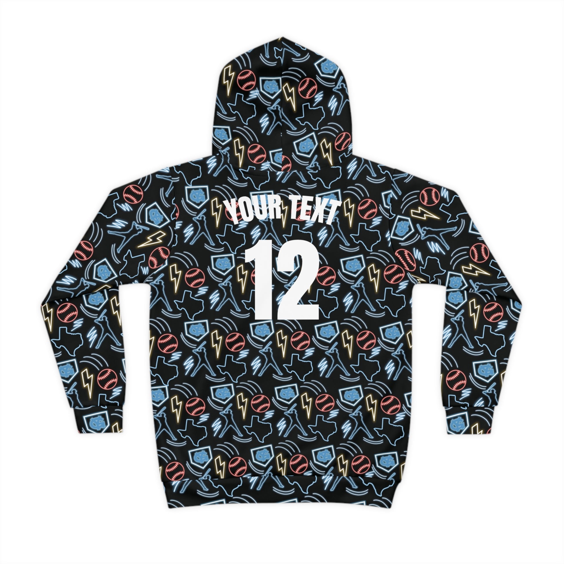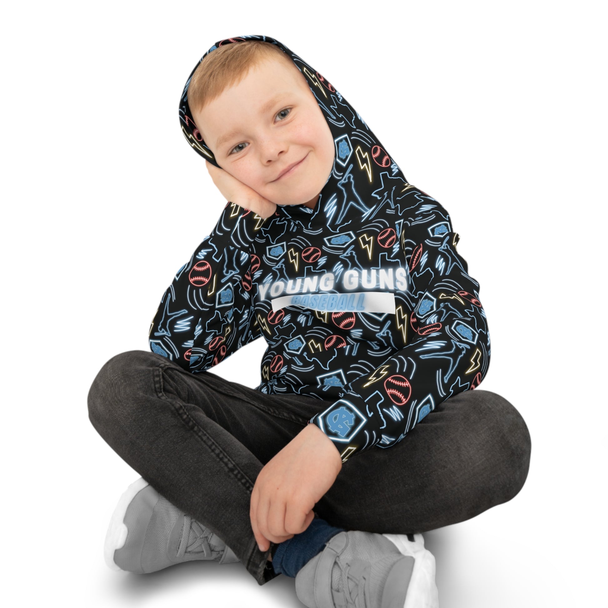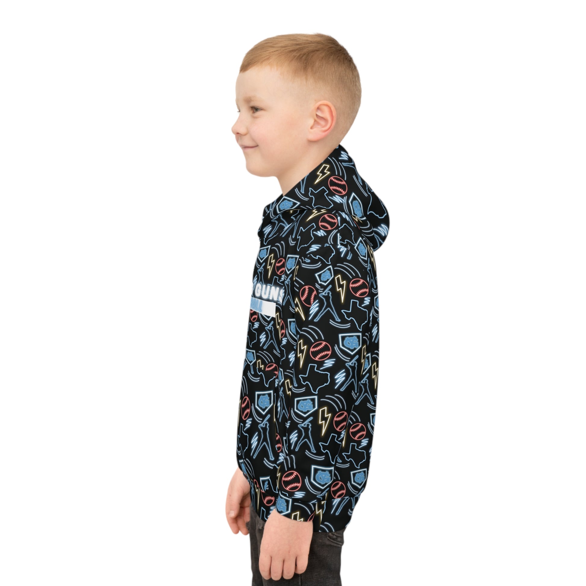 Youth Custom YG Neon Icon Hoodie with the option to customize with name and number on the back. Made of super soft and lightweight polyester-spandex knit, this hoodie is perfect for leisure or activewear. The double layer hood without drawstrings provides extra comfort and warmth, while the front kangaroo pocket adds a cozy touch. Ideal for kids who love personalizing their clothing and standing out in style. Perfect for birthdays, Christmas, and everyday wear.