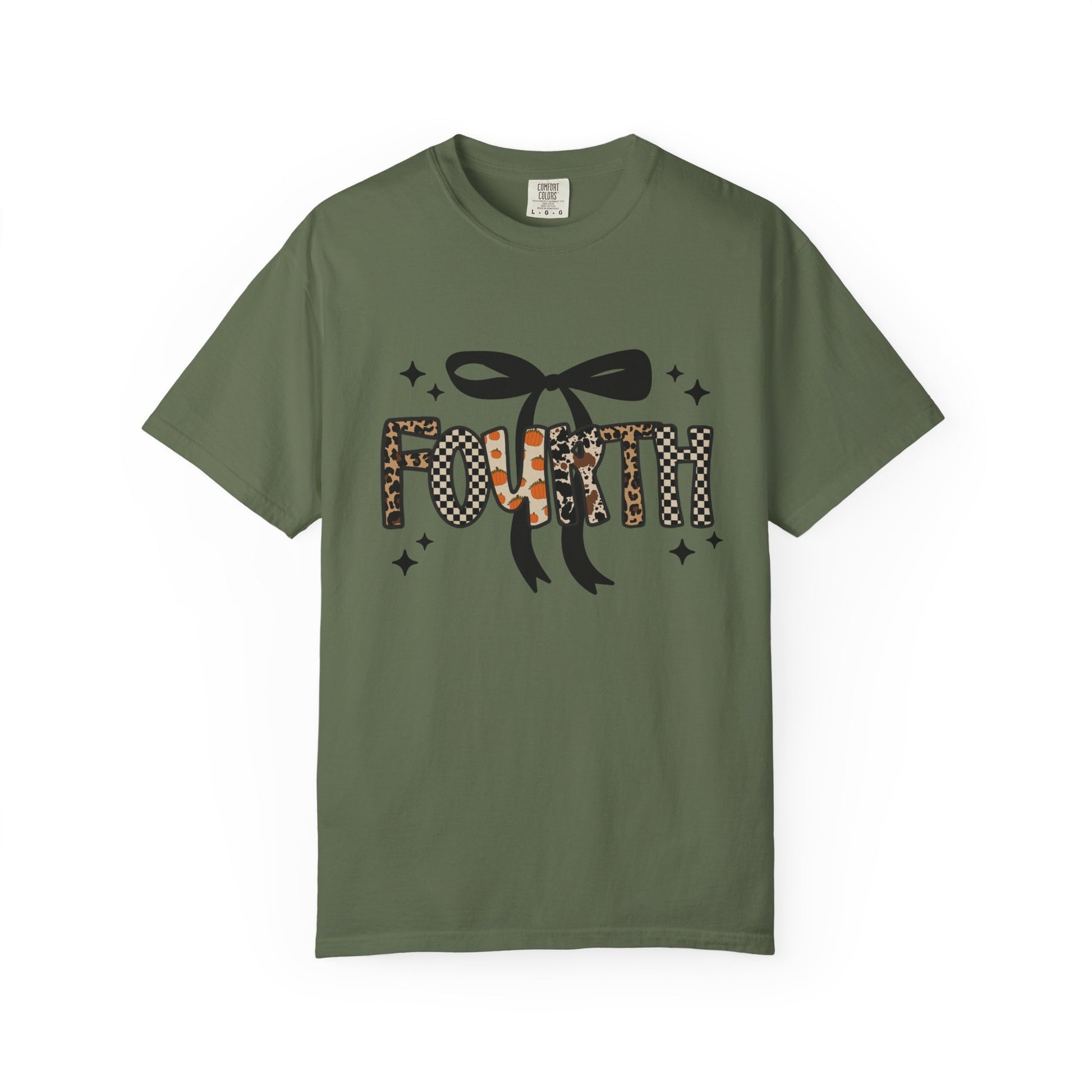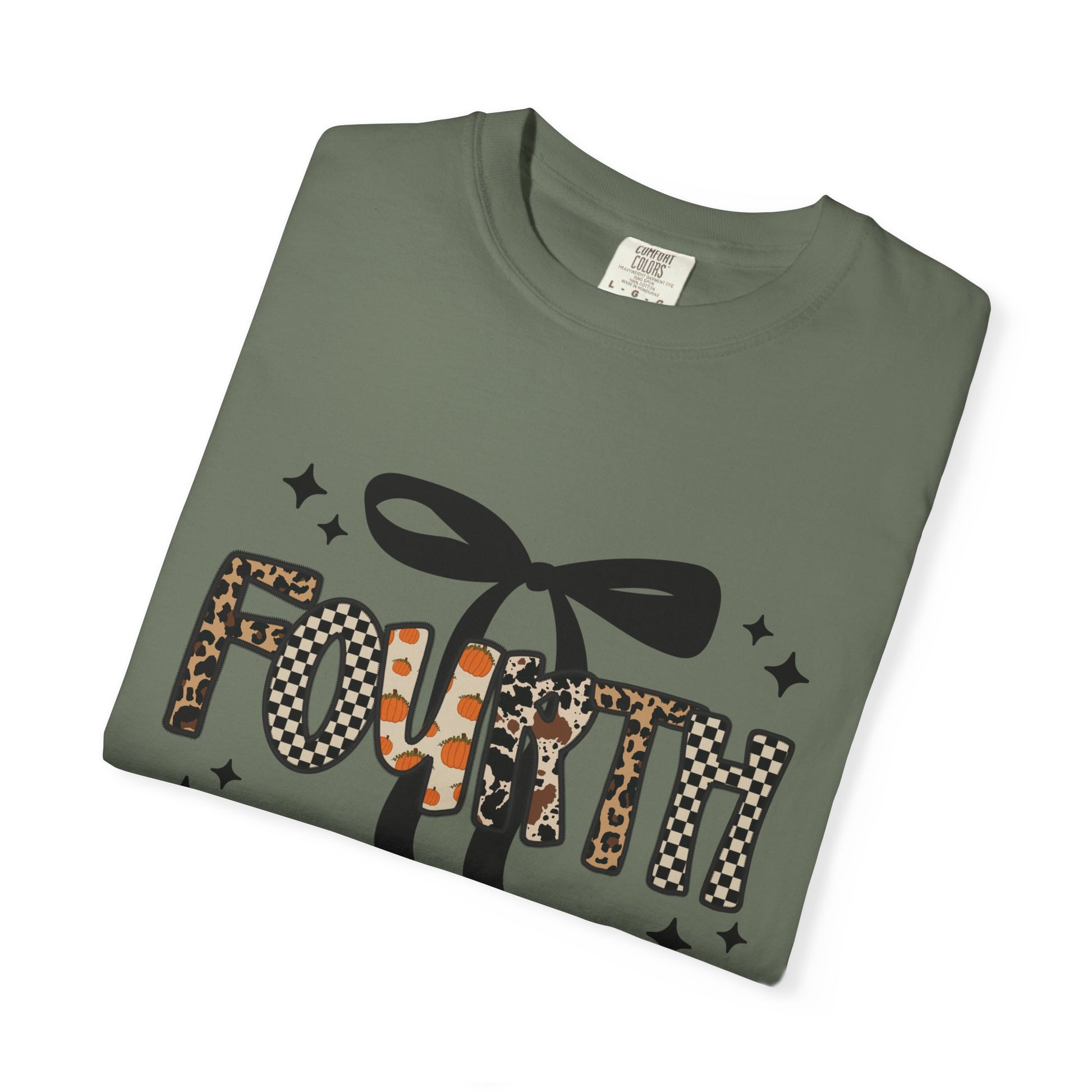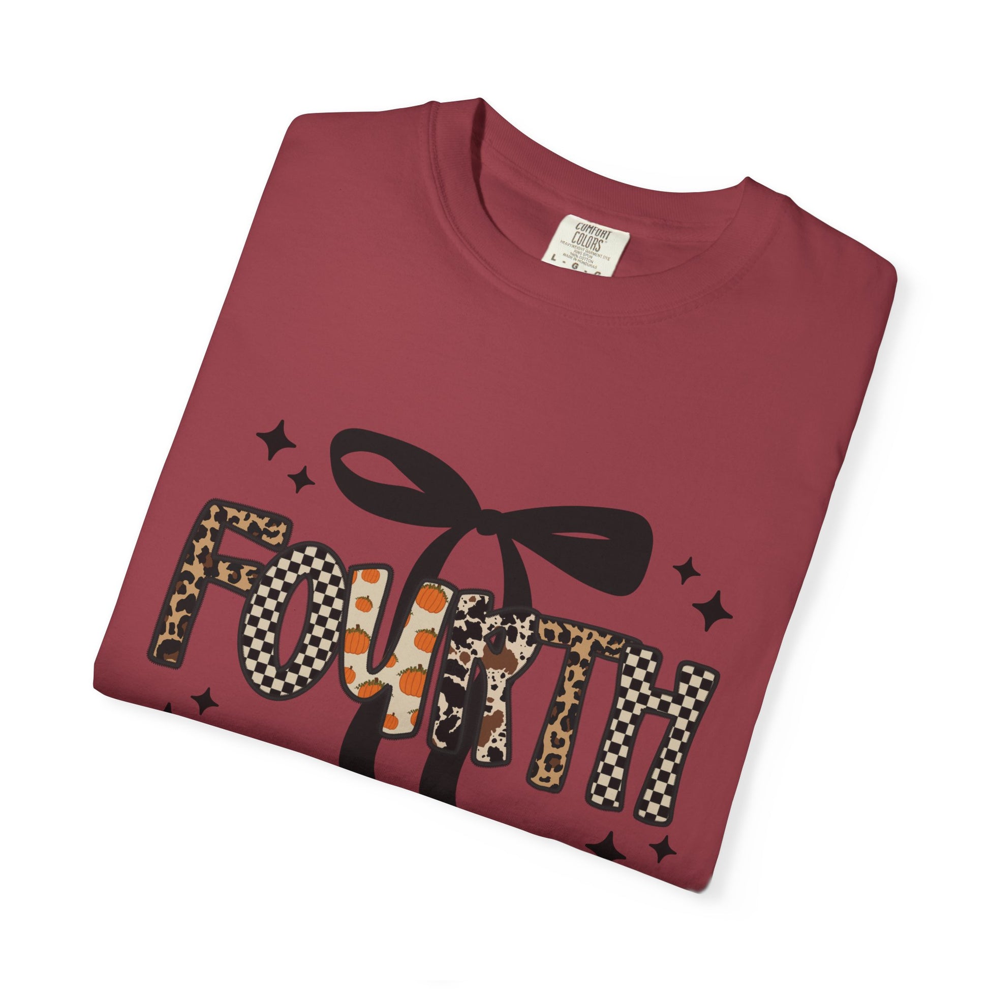 This fall-inspired unisex garment-dyed T-shirt features a faux embroidery design, perfect for Fourth Grade teachers. It gives off a cozy and welcoming vibe, suitable for casual wear or as a thoughtful gift. Ideal for teachers, educators, and anyone who enjoys autumn festivities and celebrations.