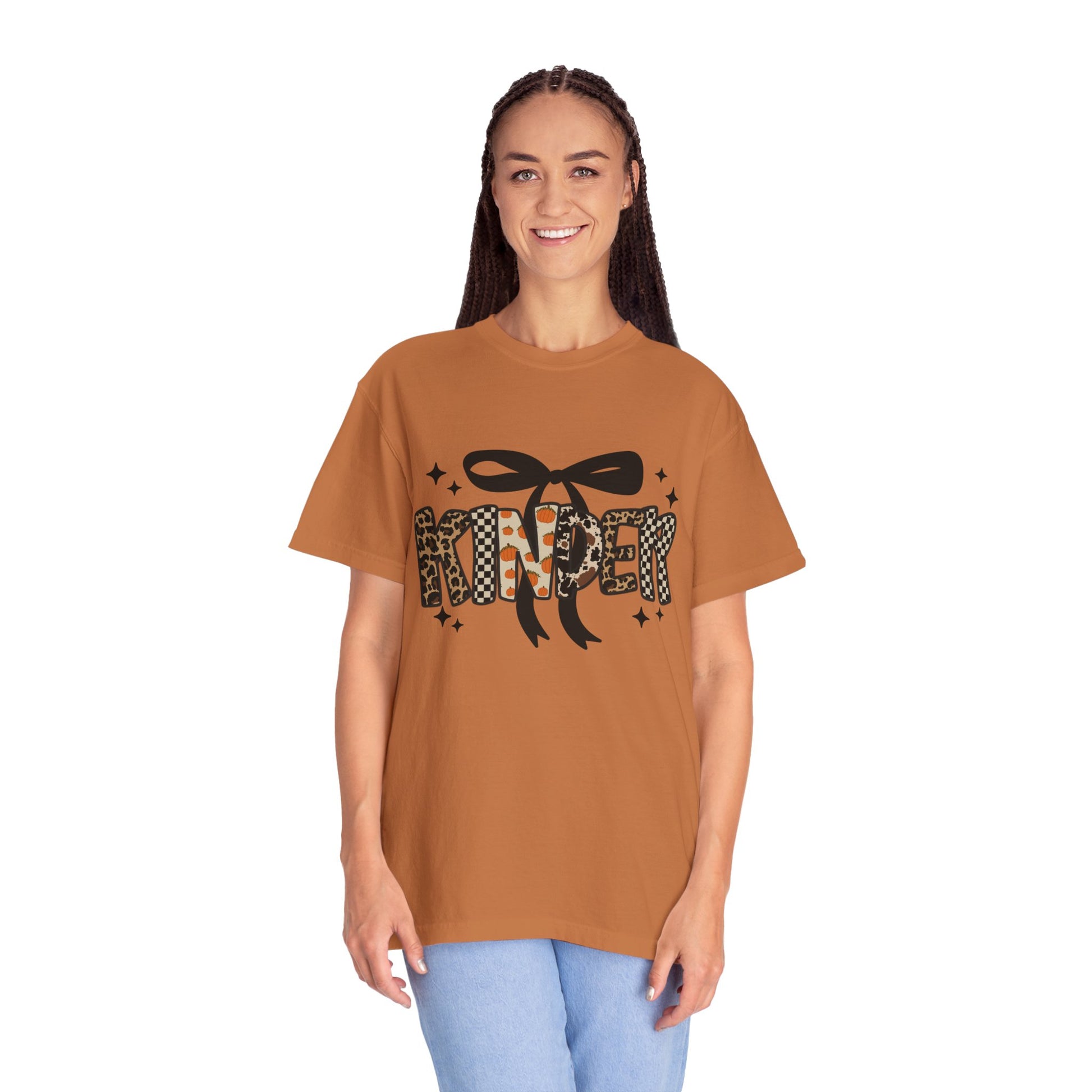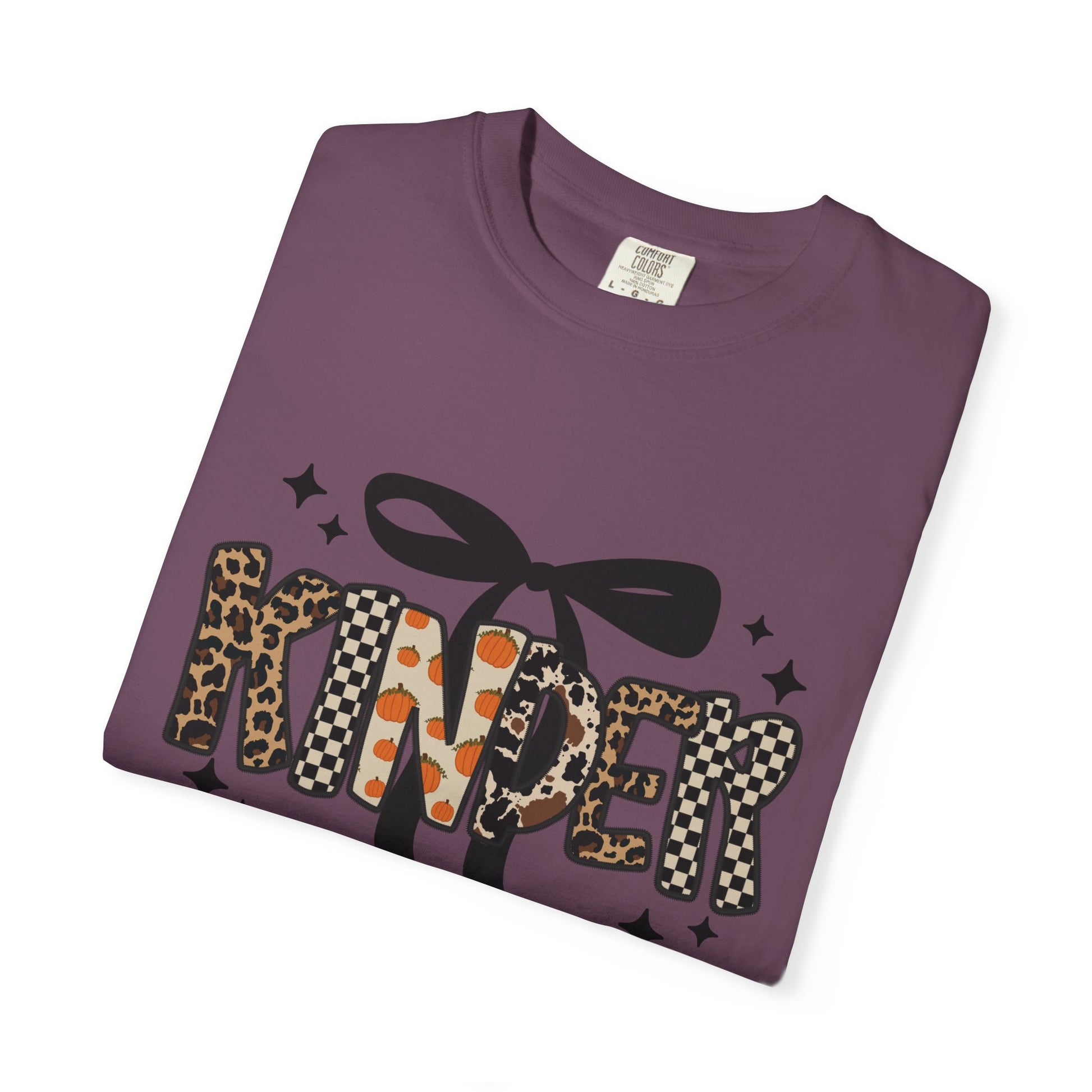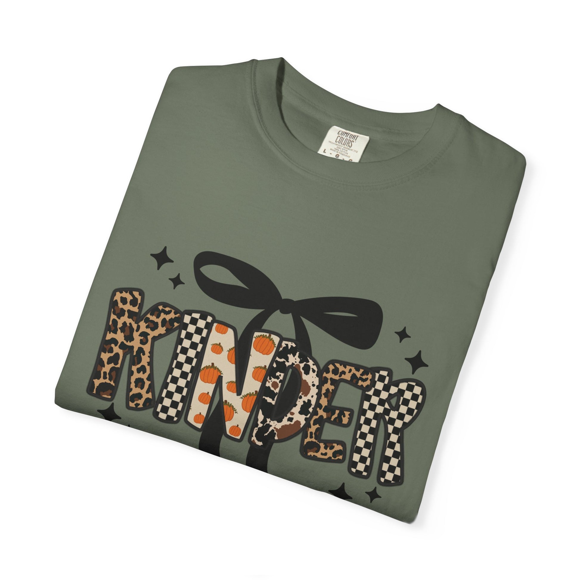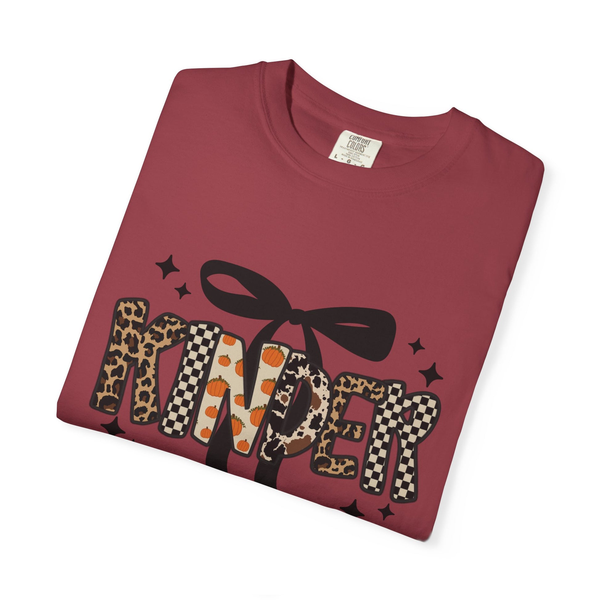 This fall-inspired unisex garment-dyed T-shirt features a faux embroidery design, perfect for kinder teachers. It gives off a cozy and welcoming vibe, suitable for casual wear or as a thoughtful gift. Ideal for teachers, educators, and anyone who enjoys autumn festivities and celebrations.