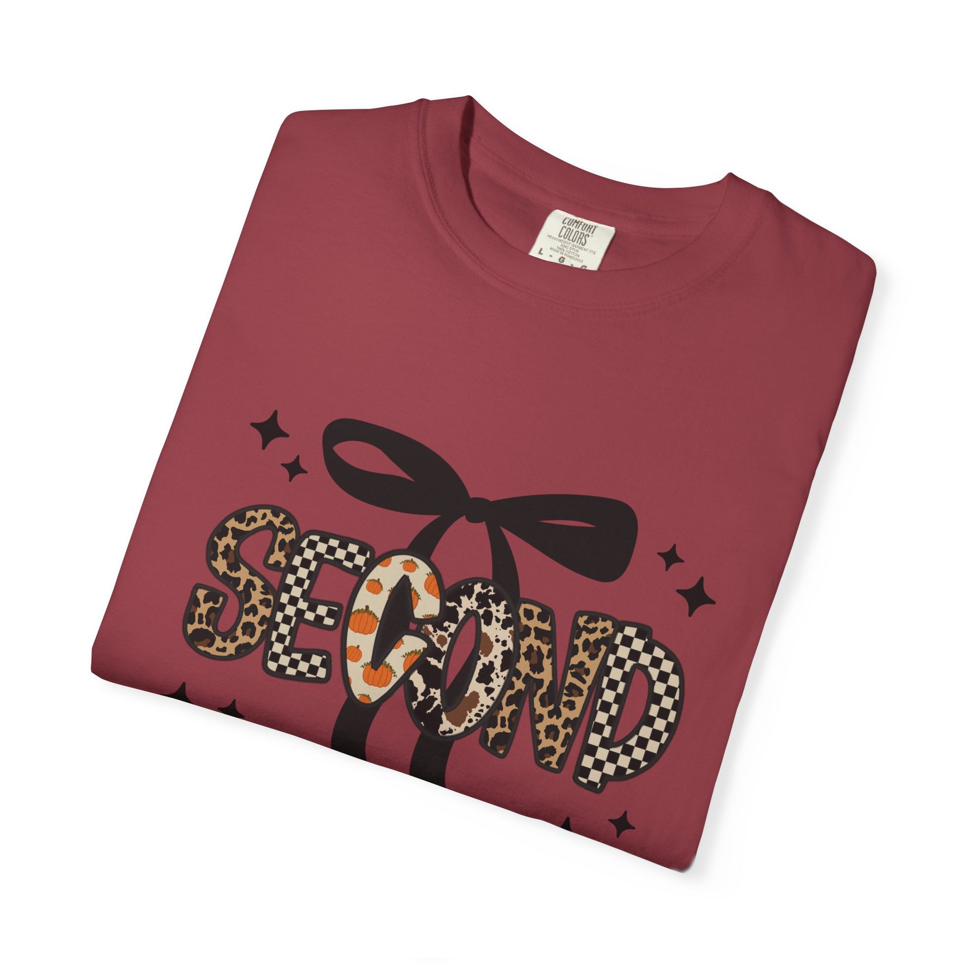 This fall-inspired unisex garment-dyed T-shirt features a faux embroidery design, perfect for Second Grade teachers. It gives off a cozy and welcoming vibe, suitable for casual wear or as a thoughtful gift. Ideal for teachers, educators, and anyone who enjoys autumn festivities and celebrations.