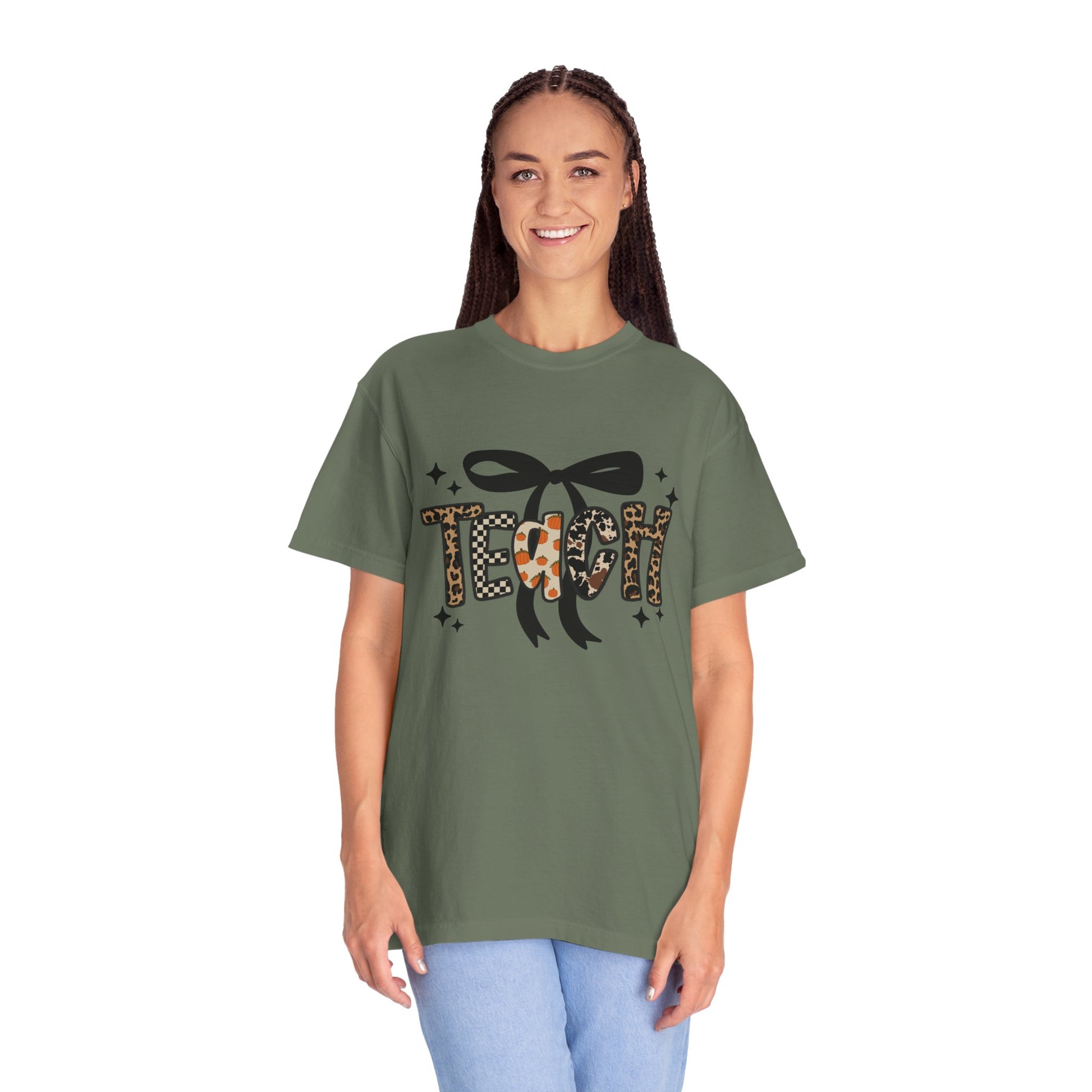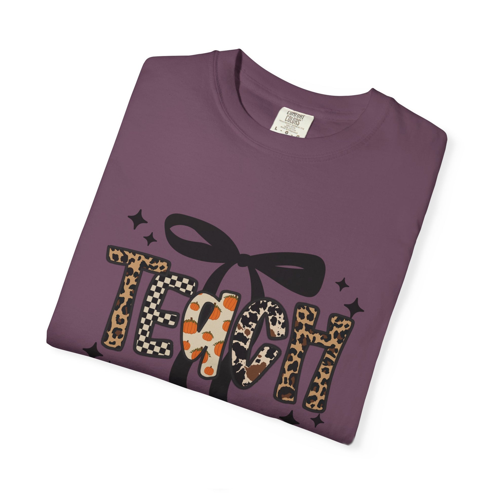 This fall-inspired unisex garment-dyed T-shirt features a faux embroidery design, perfect for teachers. It gives off a cozy and welcoming vibe, suitable for casual wear or as a thoughtful gift. Ideal for teachers, educators, and anyone who enjoys autumn festivities and celebrations.
