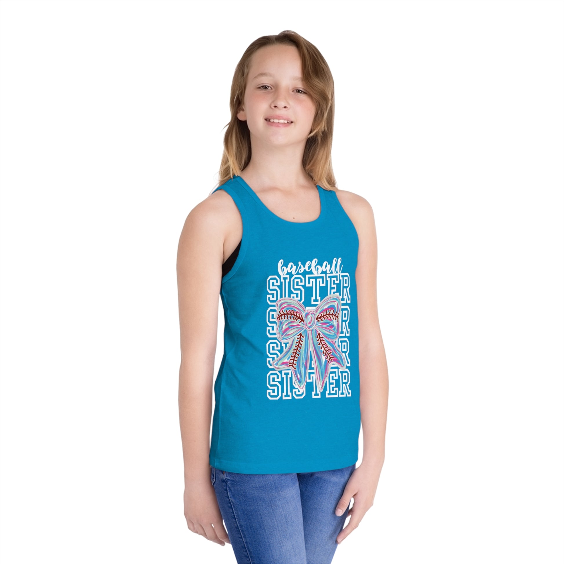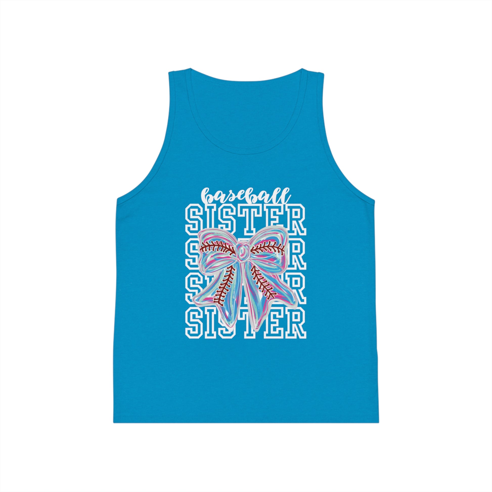 A cute and stylish kid's tank top with a baseball sister bow design. Perfect for young baseball fans and siblings supporting their player. This tank top is ideal for casual wear or to show team spirit during baseball games and events.